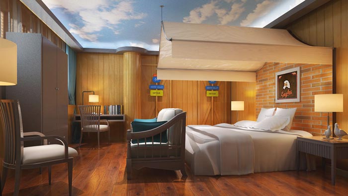 客房的設計:此處描繪的是彼此都已為人父、人母,讓戀人相互計劃自己孩子的未來,在這里讓戀人明白責任的重要,在這里雙人共同規(guī)劃了自己的未來,在未來的某一天彼此再來到此處,給人的感覺可想而知,在此次設計師希望讓戀人學會規(guī)劃自己的未來。