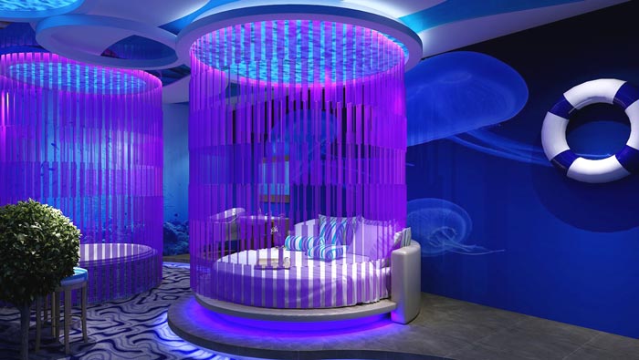 夢(mèng)幻客房的設(shè)計(jì):在這里戀人們仿佛來到了一個(gè)夢(mèng)幻的世界,在這里戀人可以度過自己的二人世界,在這里戀人們好似在海底,在海底遨游、在海底觀賞,戀人們相互依偎在一起觀賞者外面的世界,一切都是那么的美好,在這里戀人將度過一個(gè)與眾不同的夜晚。