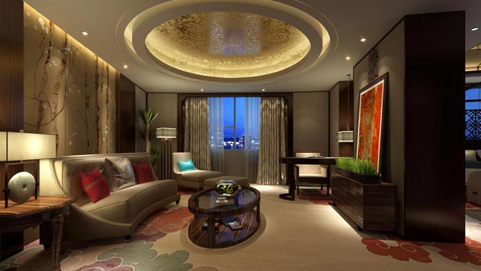 套房客廳的設(shè)計:在顧客勞累了一天之后,最需要的就是擁有一個自己的空間,當(dāng)客戶進(jìn)入客廳之后,首先感受到的就是家庭的溫暖,在此處顧客可以坐在沙發(fā)上發(fā)發(fā)呆,好好的休息一下,在設(shè)計師看來什么都不想、什么都不做,是商務(wù)人士恢復(fù)的最好途徑,同時顧客也可以在這里俯視城市的美景,讓自己勞累的身心得到釋放。