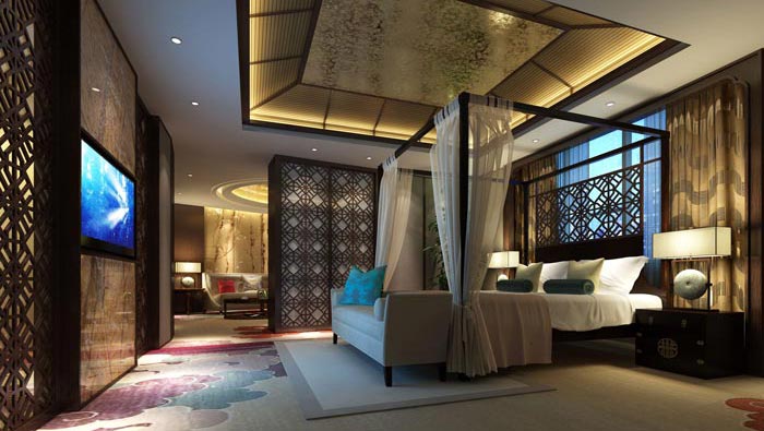 套房臥室的設(shè)計:當(dāng)顧客進(jìn)入臥室之后,首先感受到的就是溫馨,這里結(jié)合了中式的設(shè)計風(fēng)格,在這里人的精神將進(jìn)入一個深層次的休眠當(dāng)中,這樣有利于精神得到更好的恢復(fù),當(dāng)客戶躺在床上之后,會感覺到月光透過窗戶照在臉龐之上,這感覺真是愜意,月光如少女的手拂過顧客的臉龐,讓人熟睡,撫平傷痕累累的內(nèi)心。