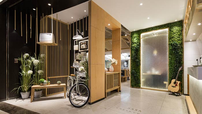 小吃店進(jìn)門區(qū)裝修設(shè)計(jì):盆栽為空間帶來了綠色,自行車為空間帶來了行動(dòng)力,吉他為空間帶來了音樂氣息,一切的一切都旨在改變?nèi)藗兊挠^念,讓客戶在這里享受傳統(tǒng)美食。