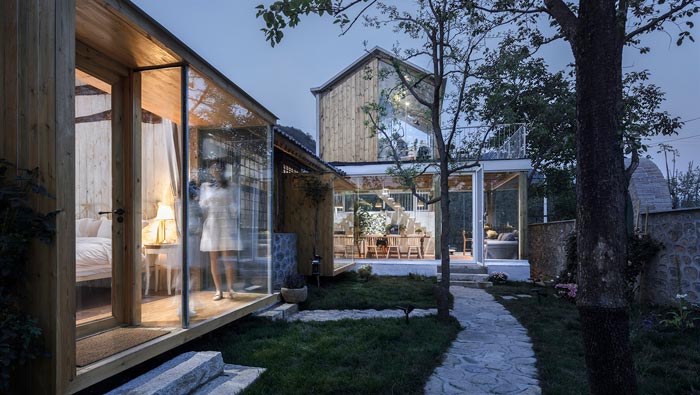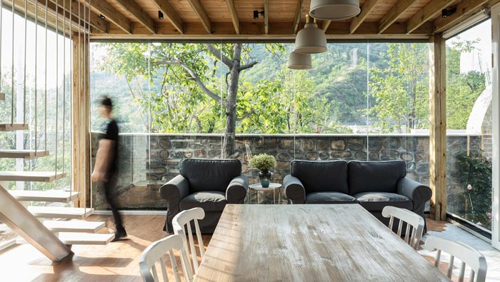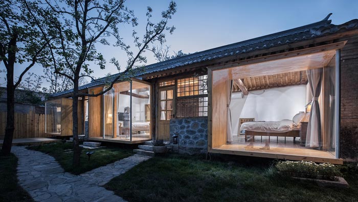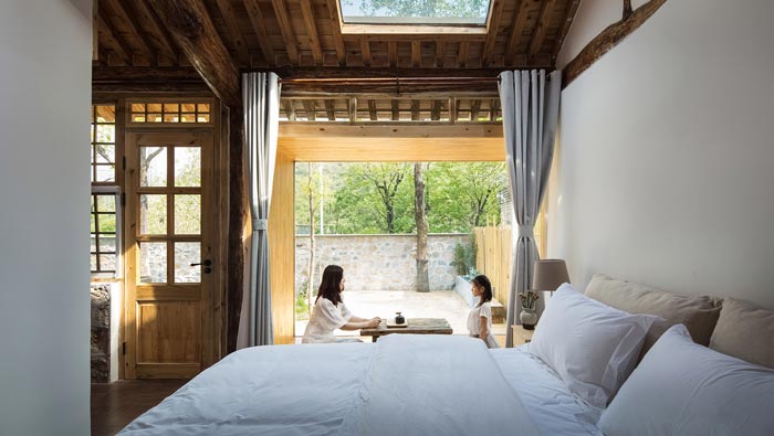 本案為鄉(xiāng)村景區(qū)民宿改造,改造策略為保留原有木結(jié)構(gòu),更新部分外界面,拆除原有破敗的屋頂,增加保溫層和防水層,增加天窗,并將原有的小青瓦回收再利用。