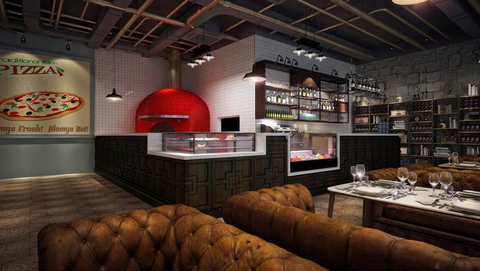 披薩西餐廳吧臺裝修設(shè)計(jì):這里是客戶點(diǎn)食品的地方,墻上大大的披薩,真可謂是色香味俱全,讓人忍不住想要嘗試一番,這是通過既視感,讓客戶對餐廳有一個(gè)主觀的認(rèn)識。