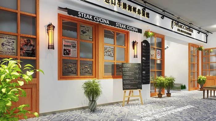 西餐廳外立面裝修設計:這里給人一種世外桃源的感覺,整個空間十分潔凈,讓人十分享受這樣的環(huán)境,進口牛排海鮮體驗館,為客戶講解著餐廳的主營餐品,簡潔明了。