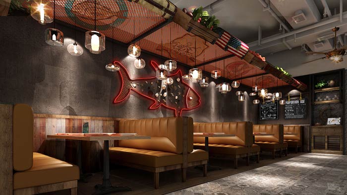 西餐廳海鮮餐區(qū)裝修設計:墻上似乎有一條魚兒在搖曳,清楚明白的告訴客戶這里屬于海鮮餐區(qū),不同的食品配以不同的就餐環(huán)境,就是希望客戶可以身臨其境的,感受與之搭配的餐區(qū)設計。