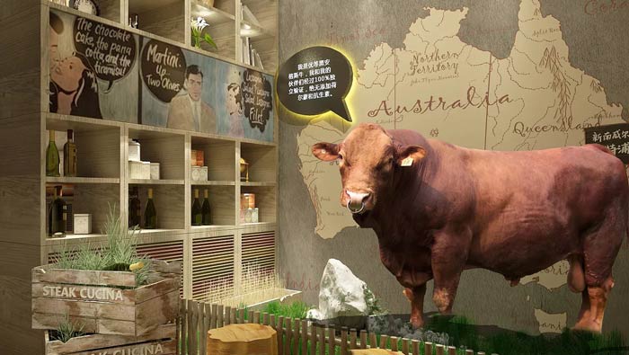 西餐廳墻畫裝修設計:優(yōu)等黑安格斯牛,背后的地圖樣式告訴客戶,它們來自于何方,青草、無污染的環(huán)境,告訴客戶它們都是天生地養(yǎng),沒有經(jīng)過任何人工的培育。