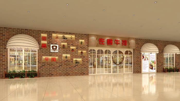 牛排西餐廳外立面裝修設計:牛排是餐廳的主打餐品,故此設計師在設計中,將牛排二字特意提出,目的就是在于強調(diào)餐廳的屬性,讓客戶知道這里的餐品是什么,而不是一概而論。