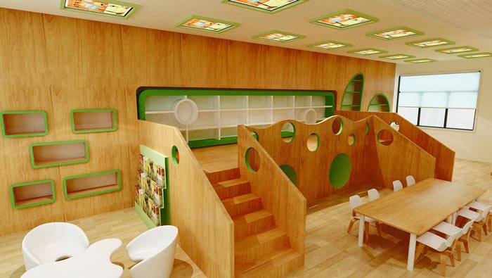 娛樂區(qū)域的設(shè)計:此處與就餐區(qū)域融合在一起,當(dāng)就餐結(jié)束20分鐘以后,孩子們可以在這里盡情的玩耍,玩耍是孩子的天性,設(shè)計師希望可以將其進(jìn)一步的延伸,讓孩子在玩耍中不斷地成長,當(dāng)玩耍累了之后,孩子們可以坐在一起看看漫畫、圖書,課外生活也是一樣的精彩。