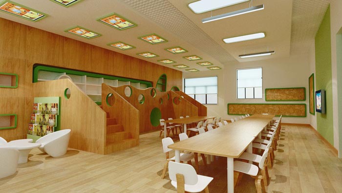 教室的設(shè)計:此空間可以容納下30個幼兒,設(shè)計師在設(shè)計中希望將一切都加以精簡,從座椅的排列與選擇上可以看出,設(shè)計師的精簡取得了效果,雖然人多了起來,但是一點(diǎn)也不會顯得擁擠,設(shè)計師要做的就是兼顧實(shí)際需求與實(shí)用之間的平衡,為孩子打造一個舒適的學(xué)習(xí)環(huán)境。