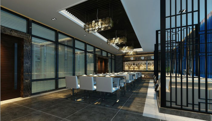 再比如封閉式包廂,說它是封閉式,但它又不完全由實(shí)墻圍合,該空間運(yùn)用了鏤空水泥磚來做走道整墻造型,包房與包房之間用部分磨砂玻璃隔斷,在保證包房一定私密性的同時(shí)增添一點(diǎn)神秘感,有別于傳統(tǒng)意義上的包房,相信在這樣的環(huán)境下用餐令人耳目一新。