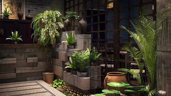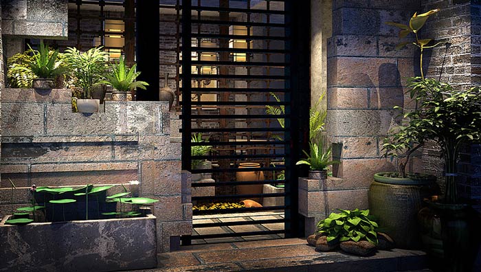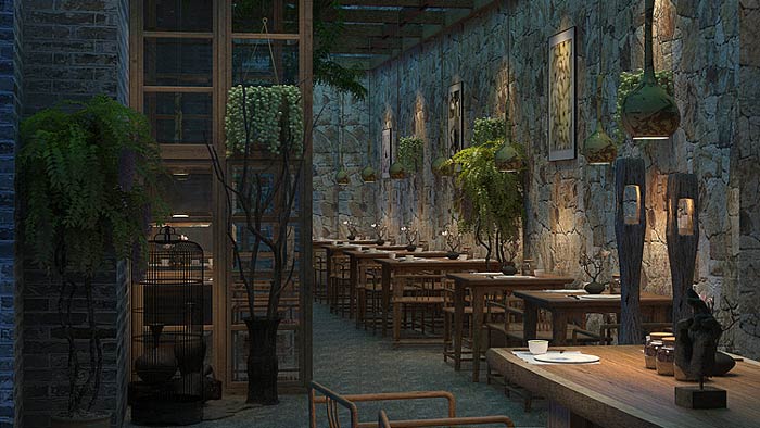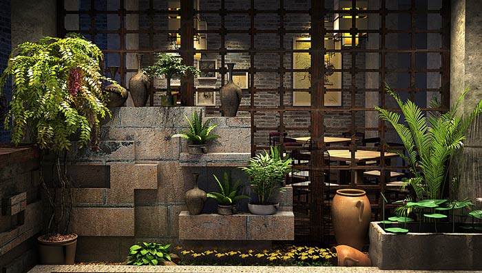 主題餐廳中庭設(shè)計(jì):此處是連接室外與室內(nèi)的過渡區(qū)域,在這里客戶感受到的是自然、舒適,這也正是設(shè)計(jì)師希望看到的,設(shè)計(jì)師希望客戶對這里充滿期待。