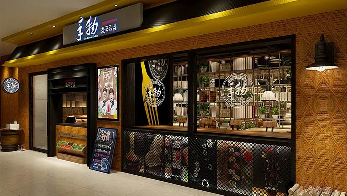 韓式主題餐廳門面設(shè)計:手物,是餐廳的名字,設(shè)計師利用各種各樣的形式,將其安置在不同的區(qū)域,讓客戶對餐廳有一個更加直觀的認識,讓企業(yè)的形得到全面展現(xiàn)。