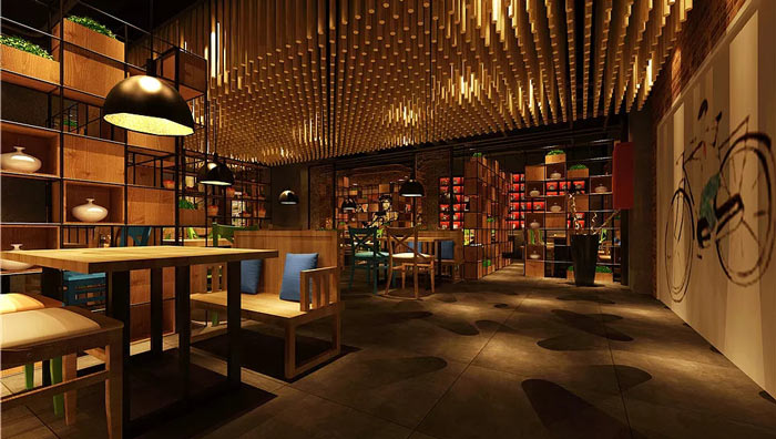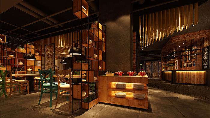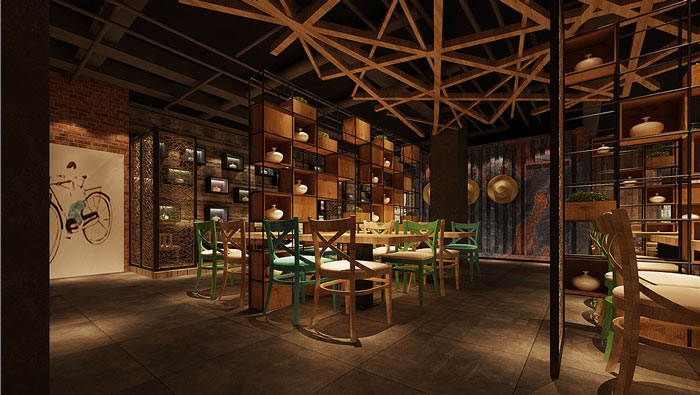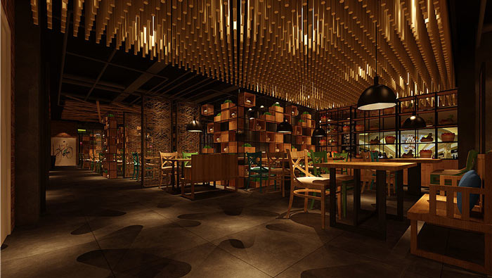 主題餐廳裝修設(shè)計(jì):多根木條組成的天花吊頂極為壯觀,由不規(guī)則的木材特制的空間隔斷也極具新意,給人以強(qiáng)烈的視覺沖擊。