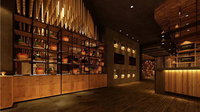 主題餐廳進(jìn)門區(qū)設(shè)計(jì):空間給人的第一感覺就是年代感,空間同時(shí)也在追求視覺沖擊感和舒適感,這兩種感覺的傳達(dá)在同一個(gè)空間毫不沖突,反而融合的恰到好處。