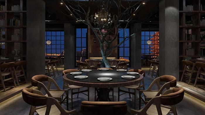 特色主題餐廳裝飾設(shè)計:中式元素強(qiáng)調(diào)的就是人與自然、人與物之間的關(guān)系,這里將這種關(guān)系進(jìn)行了很好的融合,讓設(shè)計與建筑、與環(huán)境、與自然很好的進(jìn)行融合。