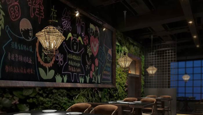 特色主題餐廳窗戶設(shè)計:這里的窗戶元素也非常簡單,用鐵絲構(gòu)成的簡易窗戶,目的就是希望用簡單裝飾空間,這樣裝飾的空間,讓人仿佛回歸自然,從復(fù)雜中剝離。