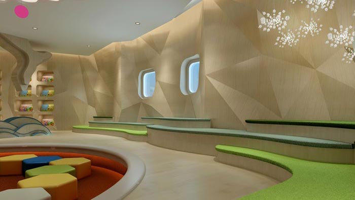 休息區(qū)域的設(shè)計:此處位于空間的一側(cè),設(shè)計師在設(shè)計中將其設(shè)計成階梯式,即增強了空間的容納能力,同時也充分考慮到孩子的興趣與愛好,對于階梯相信很多孩子都有很大的興趣,或上火下或休息讓孩子自己決定,企業(yè)的目的就是不強加給孩子任何負(fù)擔(dān),培養(yǎng)孩子自主的能力。