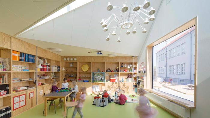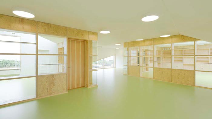 教室內(nèi)部的設(shè)計(jì):內(nèi)部有膠合板制成的“書(shū)柜墻”圍繞在空間的四周,與綠色地板一起構(gòu)成了整個(gè)空間的格局,這樣的設(shè)計(jì)為整個(gè)空間創(chuàng)造出,流暢的空間體驗(yàn)和一致性和透明度,讓孩子們?cè)谶@里成長(zhǎng)、在這里積累知識(shí)、在這里見(jiàn)證自己的童年。